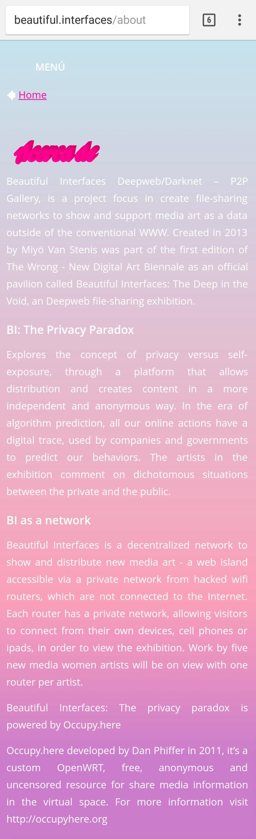 This project takes the risk of bringing to the dark side of the Internet – the Tor Network, a collection that exemplifies the influence and sensitivity of different artists around the interface’s concept into a place where the design of an enjoyable website is not the main thing. The deep web is all about information, data and how it can be protected. From the inspiring and famous social network interfaces to mobile devices the artists show us what they see as Beautiful Interfaces while the art makes its way to the deep. It’s really pleasure to recognized this project as one the first gallery/curatorial project that took placed on the Deepweb.