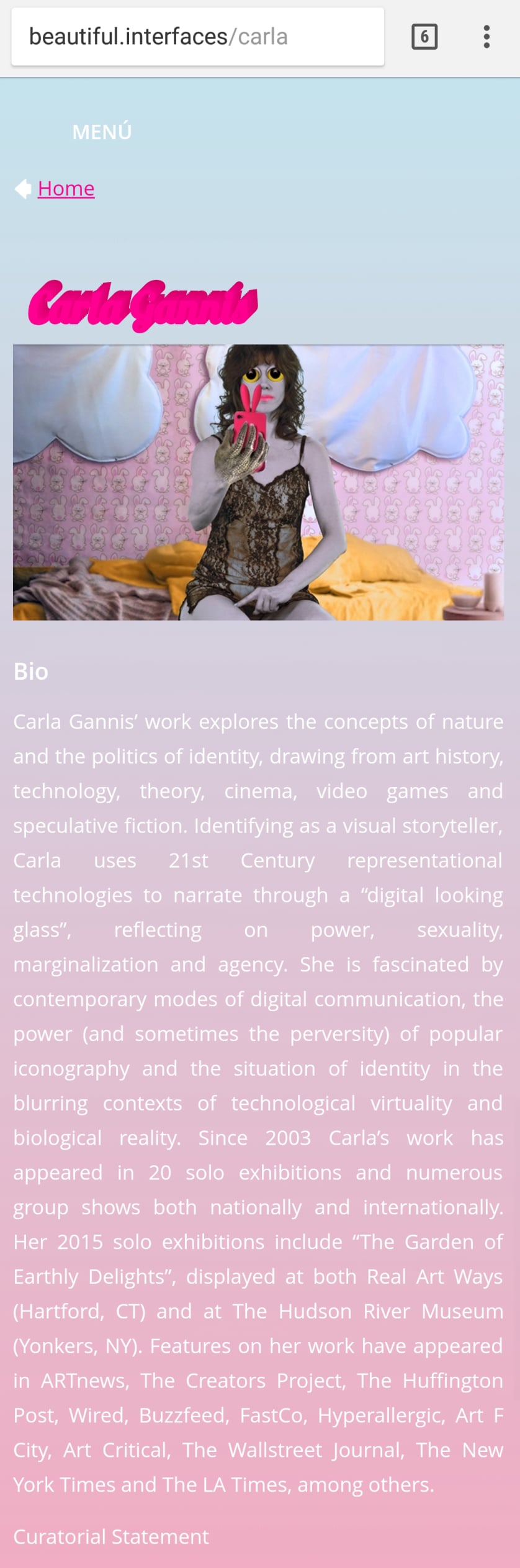 representational technologies to narrate through a “digital looking glass”, reflecting on power, sexuality, marginalization and agency. She is fascinated by contemporary modes of digital communication, the power (and sometimes the perversity) of popular iconography and the situation of identity in the blurring contexts of technological virtuality and biological reality. https://carlagannis.com/