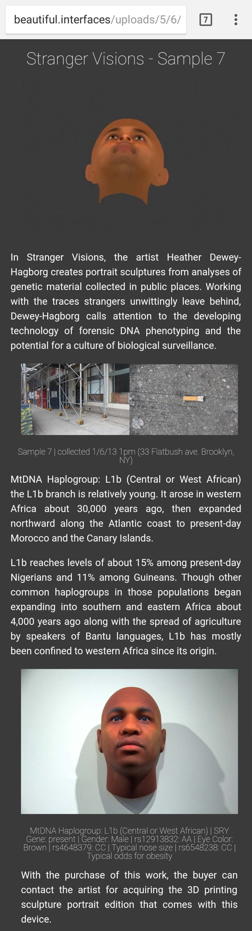 Gannis creates a distopic futuristic Graveyard where digital identity and daily online practices live forever on the collective memory of the social web; where even after we are dead, our privacy can still be exposed. Heather Dewey Hagborg works at the intersection of art and science, placing an emphasis on conceptions of the natural and the artificial. ‘Stranger Visions’ is a series of portrait sculptures created from genetic material collected in public places by the artist. Working with the traces strangers unwittingly leave behind, Dewey Hagborg calls attention to the developing technology of forensic DNA phenotyping and the potential for a culture of biological surveillance.