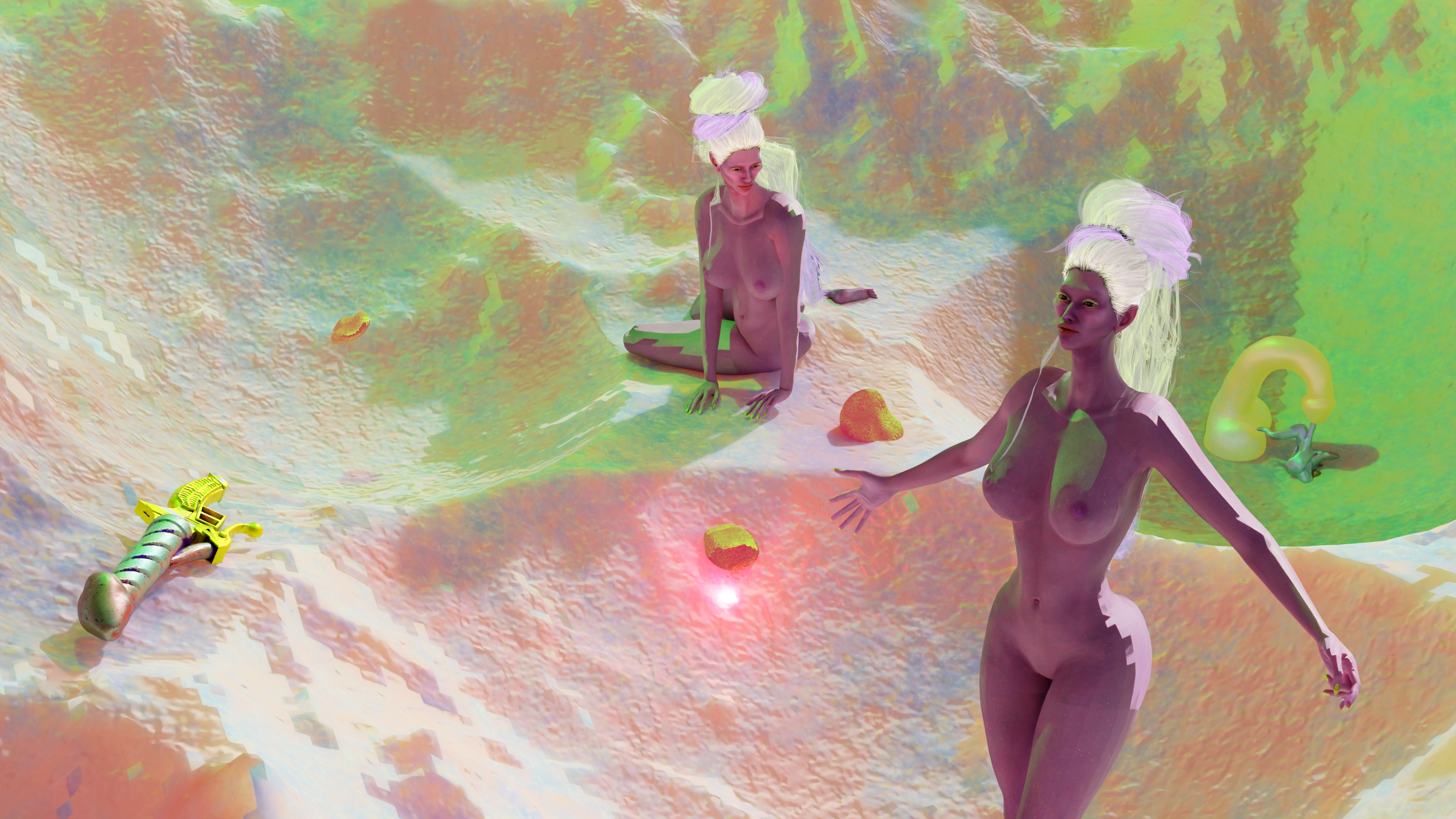 Her name encodes this tension. DBRAGA is formed from chemical elements - Dubnium (Db), Radium (Ra), and Gallium (Ga) - materials essential to contemporary technological devices. Gallium powers semiconductors; Radium evokes energy and toxicity; Dubnium signals synthetic instability. Together, they point to the extractive reality beneath digital immateriality. DBRAGA’s luminous presence is inseparable from the planetary exhaustion that sustains computation, memory, and artificial intimacy.