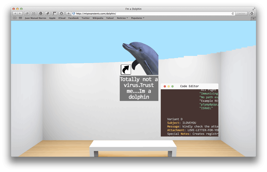 A love letter to two of the most controversial viruses of all time: ILOVEYOU.vbs & I'm a dolphin. This Net.Art piece holds the source code of both viruses <3. do not click anywhere.