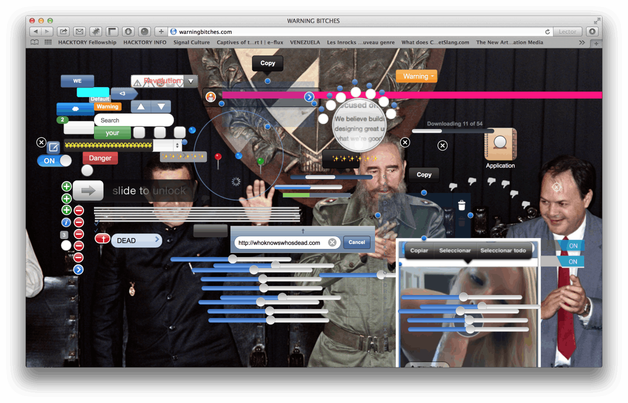 The political imbalance in Venezuela created by the power vacuum of 2012 and the anxiety caused by the mystery surrounding the illness of the former president fostered a mythical scenario for misinformation, as it was treated as a state secret; an illness in the "Fidel style"—hermetic, gradual, controlled, and with many stakes involved—was the norm in the media. From the index, this piece presents a journey and invites the symbolism of the common enemy of the Revolutions, whether Cuban, Bolivarian, or Korean: North American Capitalism; and its loyal counter-revolutionary tool: Technology. Beyond the history of the image, it depicts a composition of interfaces and elements typical of the famous Apple© and Android© mobile devices that invite the user to explore a hidden wordplay of random words related to the life of the Venezuelan leader. Between memory and historical consciousness; critique and aesthetic processes, this piece reflects Venezuela as the first political partner of the Cuban Republic.