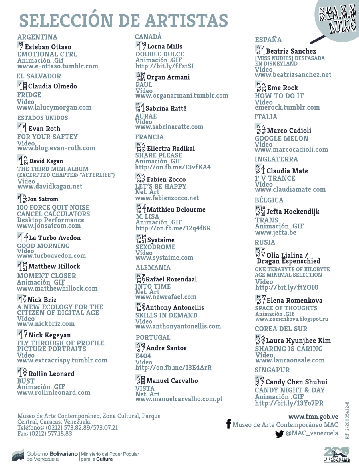 In an era dominated by immediacy, visual arts migrate to the field of virtuality, a space that unites us all and where we globally reside. Contemporary digital artists generate new concepts and relationships that challenge the art world with immaterial proposals of codes and programming, positioning themselves in a techno-social sphere where the format allows the artwork to be consumed openly, publicly, and infinitely within the domains of the Web.