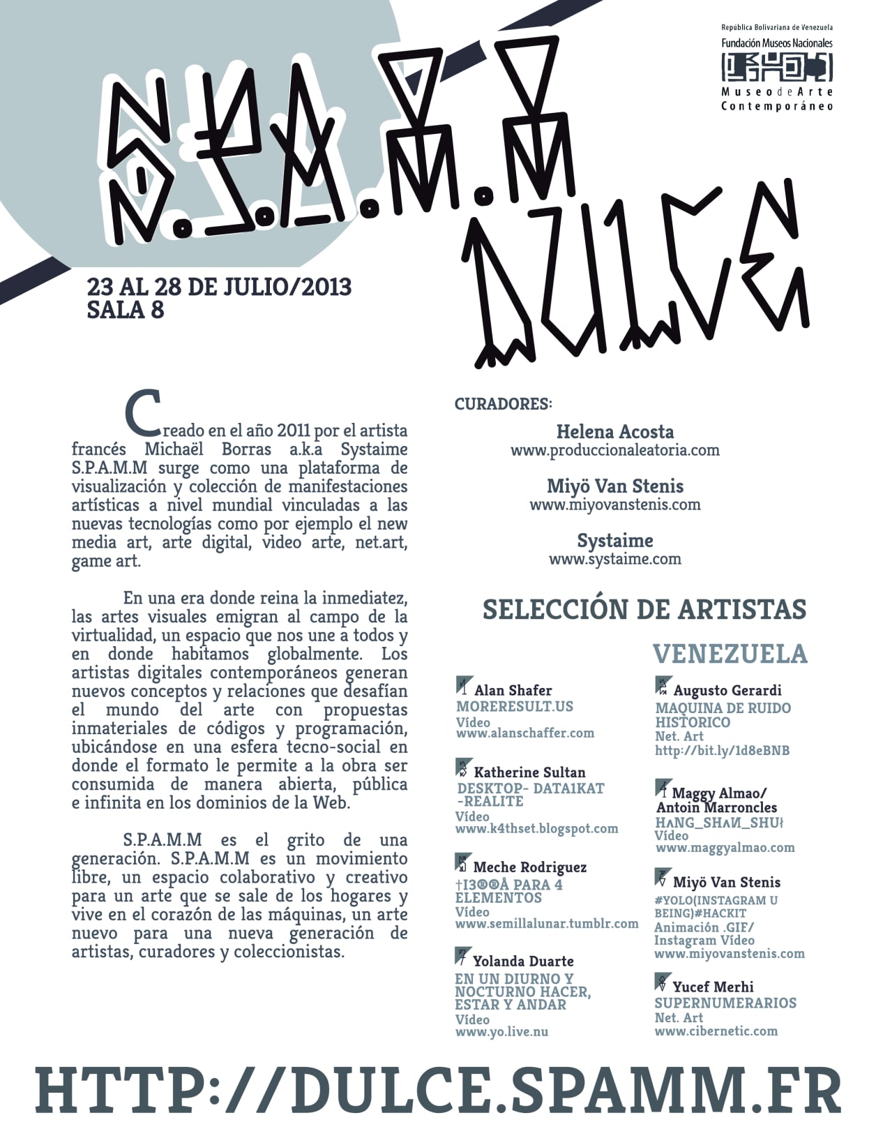 S.P.A.M.M. or Super Modern Art Museum is an international platform of Internet artists, a space open to digital creation, a decentralized alternative to the elitism of contemporary art. Founded in 2011 by the French net-artist Systaime, SPAMM is the emanation of a net-culture that defends an open access to creation and appropriation by digital artists of their work and exhibition space.