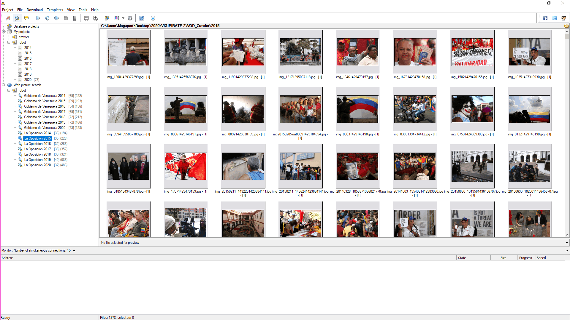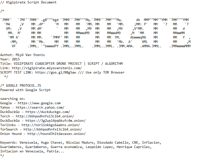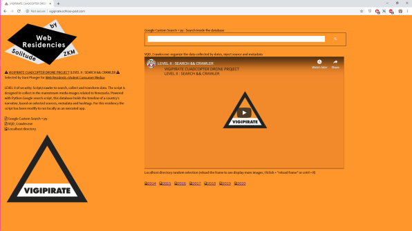 Since 2014, this algorithm has been designed to collect images and videos from the web related to the Venezuelan political situation in real time. Powered by a Python Google search script and fed by different search engines, this database holds information based on selected sources, metadata, and hashtags published in mainstream media. This script seeks reliable information on the major crisis tearing the country apart, acknowledging that numerous fake news stories are regularly broadcast. see the project @ Web Residencies by Solitude ZKM